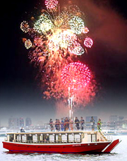 第23回東京湾大華火祭昨年に引き続き今年も船に乗るはめになってしまいました。「第23回東京湾大華火祭」今年の船は昨年までと違い屋形船で屋根が付きエアコンまで完備されてました。 さて今年の東京湾大華火祭は朝から風が出てたので船は大揺れ、今年もゲストの何人かは東京湾到着後、酔って花火が始る前にダウン!!例年恒例の紹興酒の瓶が差し入れられ、その蓋を開けるのが大仕事なんですが、昨年は船宿「縄定」の向いの台湾料理屋さんに開けて頂きましたが今年はなんと定休日「ゲェ」 出航から東京湾まで紹興酒の蓋の石膏をハンマーで叩き続けなんとか蓋を開けるのに成功。さて今年は船の数が昨年よりも少ないような… やはり天気のせいかな?? でもその風のおかげで煙りが流され花火がより鮮やかに見る事が出来ました。2年連続の東京湾大華火祭、来年の私の接待参加は絶対にありません。 |
