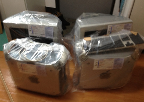 iMacがやって来て1ヵ月、だましだまし使って来たマックともいよいよお別れです。パソコンリサイクルへ連絡し、全てで\15,000振込みまもなく郵便局のかたが集荷に来てくれます。一応ハードディスクは外し手元に置いてきます。2セットコンピュータに見えますが1台のマックに対しモニター1台、デュアルモニターで使ってました。もう1台のマックはサポート用の物です。 |