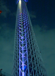 ライトアップ新小岩での仕事帰り、平井大橋にかかると東京スカイツリーが目の前に現れます。もちろん何度も見ている光景です。開業を1ヶ月後に控えたスカイツリーは錦糸町を超えたあたりから様子を変えて行きました。なんとブルーのライトアップでスカイツリーが浮き上がっているではありませんか、初めてライトアップされたスカイツリーを見て少し特した気分になりました。 |