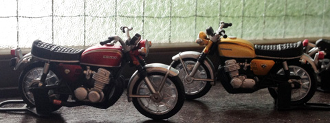 何気なく買ったカンコーヒーに付いていた食玩。このバイクのフィギュアにハマり14台中12台揃えました。残りの2台は「KAWASAKI Z400FX」と「HONDA CB750F」のブラックバージョン。まあこの2台は良しとしましょう。先日までルパンの自動車フィギュアでかなりポップな感じでしたが今回のヨシムラチューニングバイクはとてもクールです。思わず見いってしまいます。 |